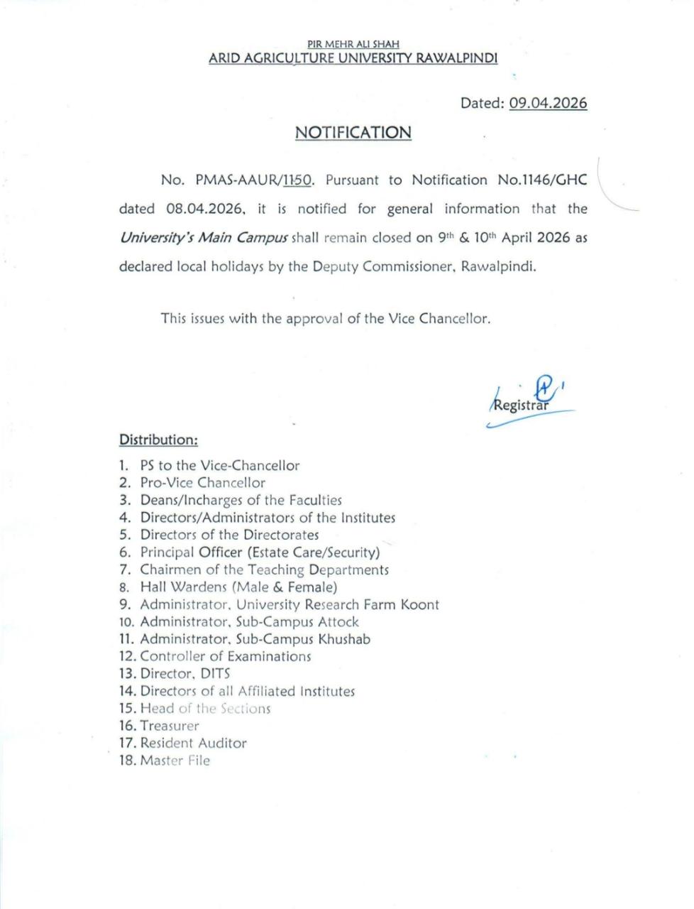 Welcome to PMAS-Arid Agriculture University, Rawalpindi. Being an Agricultural Institution, our main objective is to produce high quality Agricultural Scientists. Therefore, we are committed with the philosophy that we advance our farmer community by sharing positive and proven ideas and experiences. Along with Agricultural Sciences, the university offers degree programs at all levels in basic and Natural Sciences, Social Sciences, Humanities, Management Sciences, Computer Sciences and Information Technology.